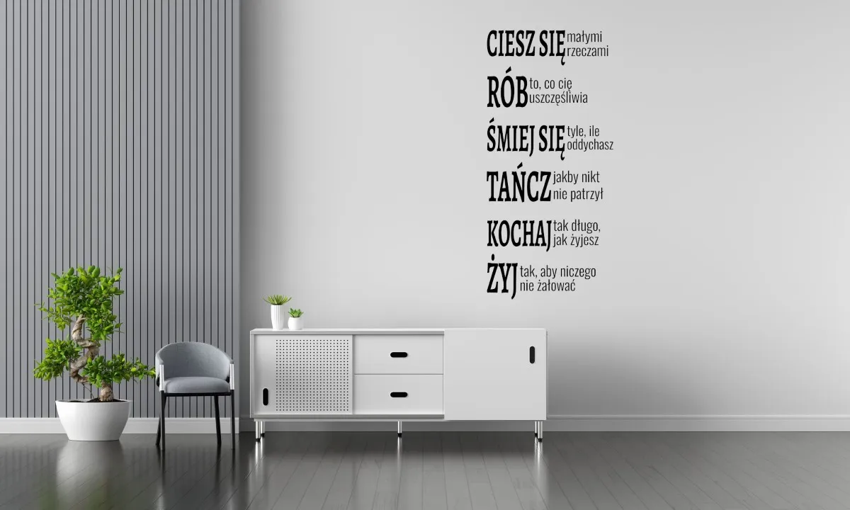 Chcesz szybko i efektownie odmienić wygląd swojego wnętrza? Naklejka na ścianę „Ciesz się małymi rzeczami”, to idealne rozwiązanie, które pozwoli Ci nadać przestrzeni wyjątkowy styl bez potrzeby przeprowadzania kosztownych remontów. Nasze dekoracyjne naklejki to połączenie estetyki, funkcjonalności i wysokiej jakości materiałów, dzięki czemu będą świetnym dodatkiem do każdego pomieszczenia.